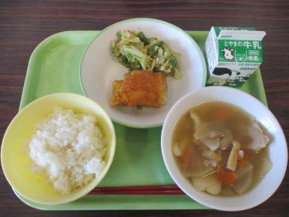 28日(金)きょうの給食 公開日 2022/10/28 更新日 2022/10/28 きょうの給食 今日の給食を紹介します。上左から 平皿(グリーンアスパラのごまだれ、揚げ魚のレモン味) 牛乳 根菜汁 ごはん 大根、れんこん、ニンジンなどの野菜や里芋がたっぷり入った「根菜汁」は、あっさり風味で、とってもヘルシーですね。