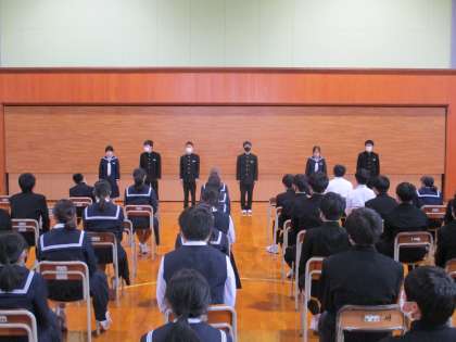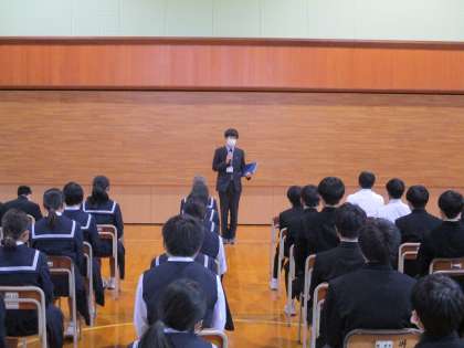 その後、今まで事業所ファイルの作成やポスターの準備を進めてくれた「14歳の挑戦」実行委員に感謝の言葉が伝えられました。最後は、学年主任の黒地先生からの話がありました。