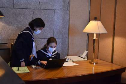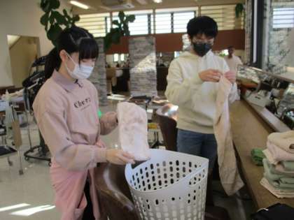 15日(火)「社会に学ぶ『14歳の挑戦』」その7 公開日 2022/11/15 更新日 2022/11/15 14歳の挑戦 【上:HAMAZAKI】タオル畳んでいます。 【中:ANAクラウンプラザホテル富山】 メッセージカードの作成をしています。 【下:富山ゴールデンボール】受付をしています。