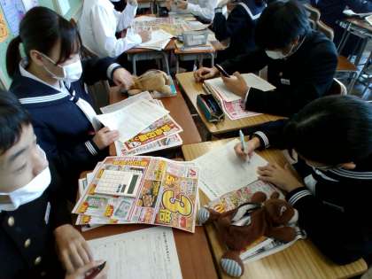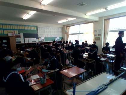 3年生の授業の様子を紹介します。 【写真上:理科】 【写真中:社会】 【写真下:英語】