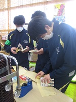 16日(水)「社会に学ぶ『14歳の挑戦』」その12 公開日 2022/11/16 更新日 2022/11/16 14歳の挑戦 【上:文苑堂本郷店】ブックカバーを付けています。 【中:そば処大庵】お蕎麦を運んでいます。 【下:パティスリー・ヴェルフヲンス】 ケーキのフィルムを巻いています。