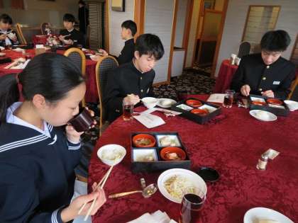 5日(月) 金沢校外学習【2年】昼食の様子 公開日 2022/12/05 更新日 2022/12/05 2学年 昼食会場の様子です。3箇所に分かれてお昼を食べました。 【写真上:堤亭】 【写真中:ニューグランドホテル】 【写真下:ガーデンホテル金沢】
