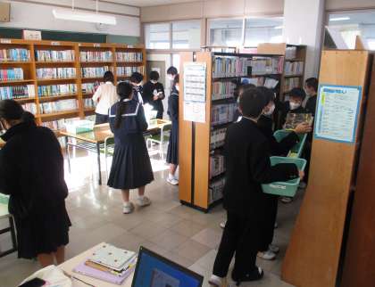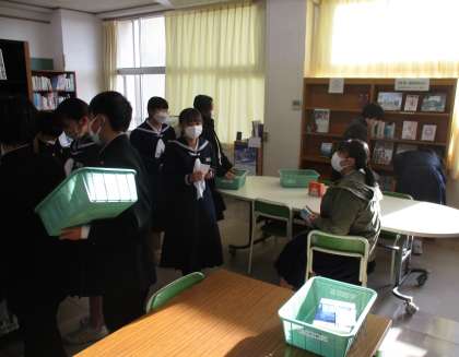 12日(月)「おでかけ図書室」【図書委員会】 公開日 2022/12/12 更新日 2022/12/12 生徒会 本日の放課後に行った、図書委員会の後期活動のひとつ「おでかけ図書室」準備の様子です。 普段は図書室を利用していない人にも手軽に読書に親しんでもらうため、各クラスに設置する本を図書委員で選びました。この機会に、是非とも面白い本と出会ってくださいね。