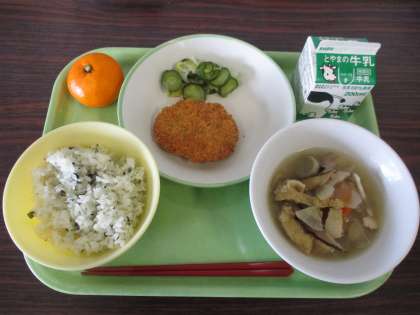 今年の冬至(とうじ)は22日(木)。冬至とは1年で1番、太陽の出ている時間が短く、夜が長い日です。今日のメニューは、冬至にちなんだ「根菜汁」に加えて、「柚和え」と「かぼちゃコロッケ」でした。