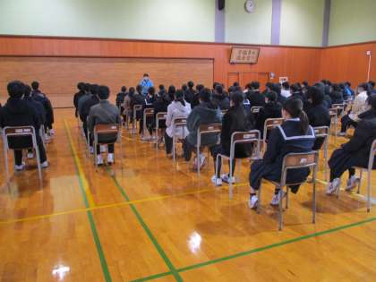 3年生の学年集会の様子です。 受検前最後の長期休みである冬休みの過ごし方について確認しました。