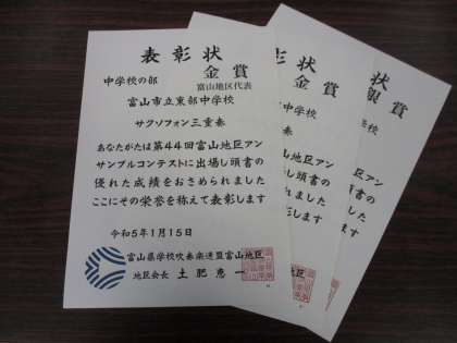 婦中ふれあい館で行われた第44回富山地区アンサンブルコンテストにおいて、本校吹奏楽部はエントリーした3チームのうち2チームが金賞となり、そのうちサクソフォン三重奏で県代表となりました。