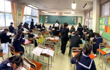 1年生の授業の様子を紹介します。 【写真上:社会】 【写真中:家庭科】 【写真下:保健体育】