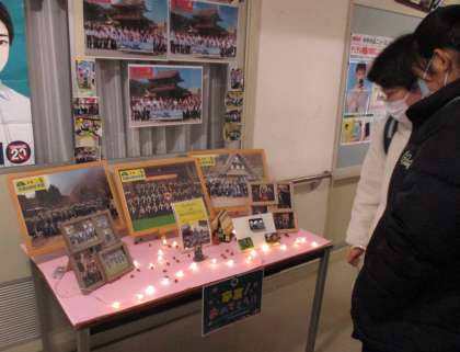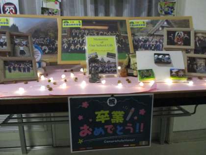 先月来、保健室前廊下に、3年生の卒業を特集した展示コーナーが設けられています。