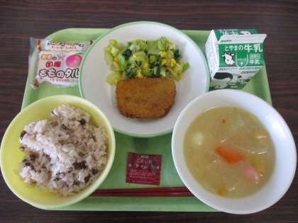 今日の献立は、昨日のひな祭りメニューに引き続き、3年生の卒業を祝う「赤飯」と「紅白白玉汁」、県立高校一般入試を激励する「とんかつ(勝つ)」と、特別感いっぱいのメニューでしたね。