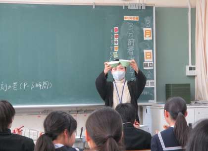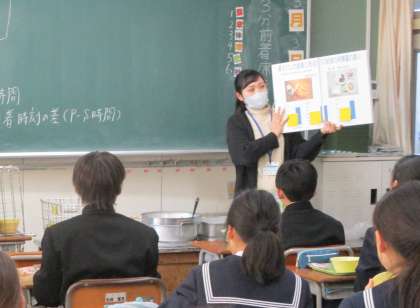 給食準備の様子を見られた後、給食中の13Hで栄養に関する講話をしていただきました。その知識を、是非これからの生活に役立てていきましょう。