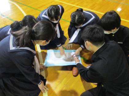 事前に学年生徒会のメンバーが先生にアンケートをとったり、校内を調べたりして準備した50問のクイズを、班対抗で解いてポイントを競い合いました。