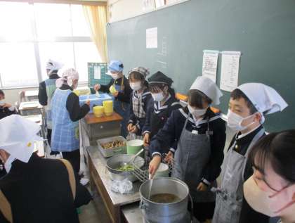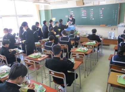 今日は、1年生にとって中学生として初めての給食でした。マイエプロンを身につけた給食当番が、まだ少しぎこちない様子で配膳に取り組みました。