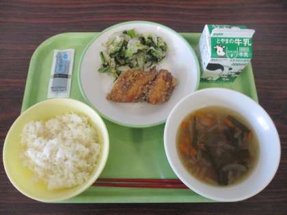 10日(月) きょうの給食 公開日 2023/04/10 更新日 2023/04/10 今日の給食 今日の給食を紹介します。上左から のり佃煮 平皿(ゆかり和え、あじの竜田揚げ) 牛乳 春雨スープ ごはん 今日は、1年生の給食初日でした。小学校と中学校では、給食に何か違いはありましたか?