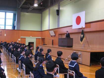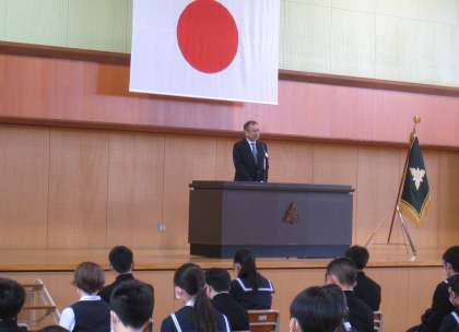 本日1限、第28代校長の白石 豊先生を講師にお招きし、創校記念式を行いました。