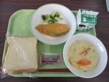 25日(火)きょうの給食 公開日 2023/04/25 更新日 2023/04/25 今日の給食 今日の給食を紹介します。上左から 平皿(ブロッコリーサラダ、サーモンフライ) 牛乳 クリームチャウダー メープルジャム 食パン 本日のサミット給食はカナダの献立でした。サーモンにメープルとカナダ名産の食材が使われたメニューでしたね。