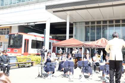 午前11時ちょうど、富山駅長さんの開会宣言とともに、東部中吹奏楽部13人のファンファーレが鳴り響きました。