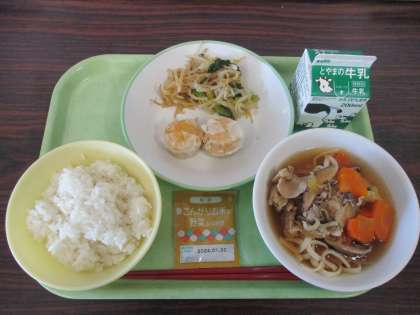 15日(月) きょうの給食 公開日 2023/05/15 更新日 2023/05/15 今日の給食 今日の給食を紹介します。上左から 平皿(おひたし、にんじんシューマイ) 牛乳 かやくうどん 野菜ふりかけ ごはん 「かやくうどん」は、関西で一般的な呼び名で、かまぼこ・しいたけ・のりなど様々な具を入れたうどんのことを意味しているそうです。