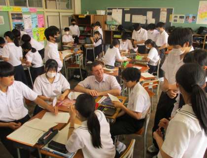 日本の伝統文化の一つである「俳句」を題材に、現在完了形の3つの用法と現在完了進行形について学習しました。グループで寸劇をするなど、楽しく授業に取り組みました。