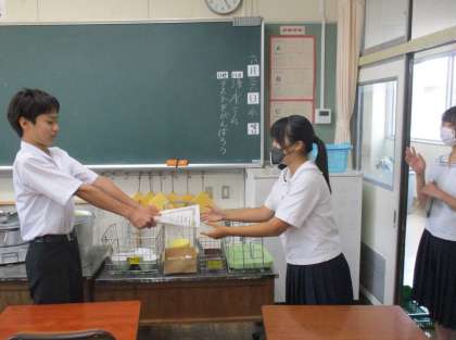 28日(水)WBC(ワールド・ベル着・クラシック)表彰 公開日 2023/06/28 更新日 2023/06/28 生徒会 本日の給食時間、先週実施した生徒会執行部の活動「WBC(ワールド・ベル着・クラシック)」の表彰を行いました。 ベル着達成レースの結果は、何と1年生の上位独占となりました。