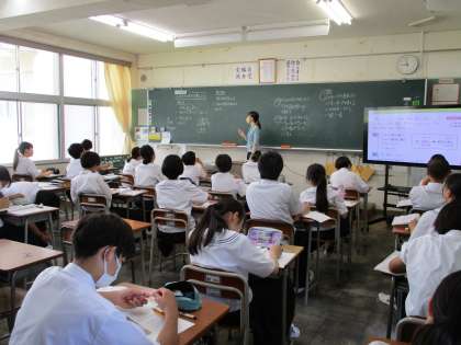 1年生の授業の様子を紹介します。 【写真上:社会】 【写真中:数学】 【写真下:保健体育】