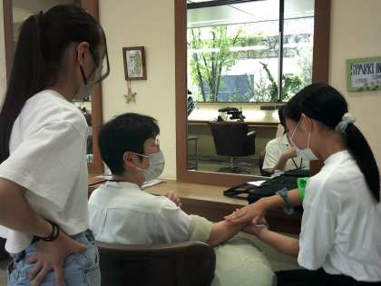 11日(火)「社会に学ぶ『14歳の挑戦』」その9 公開日 2023/07/11 更新日 2023/07/11 14歳の挑戦 本日は、「社会に学ぶ『14歳の挑戦』」の1日目でした。活動の様子を紹介します。 【写真上:古城モータース】 【写真中:HAMAZAKI】 【写真下:そーう美容室】