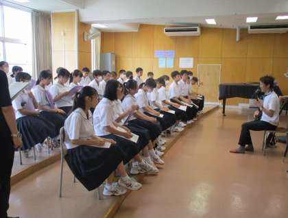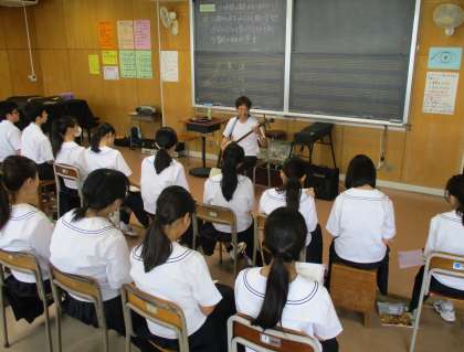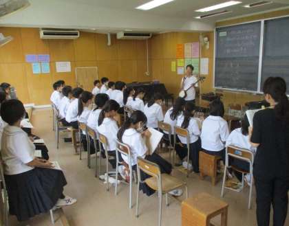 12日(水)三味線を学ぶ【1学年】 公開日 2023/07/12 更新日 2023/07/12 1学年 本日の音楽の授業で、三味線の師範である濱谷拓也さんを講師にお招きし、1年生は和楽器について学びました。初めて三味線を見る生徒も多い中、興味深く授業に取り組みました。