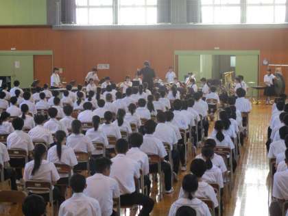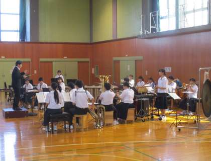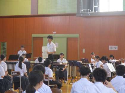 24日(月)受賞報告会 その2 公開日 2023/07/24 更新日 2023/07/24 東部中学校の様子 受賞報告会では、昨日行われた吹奏楽コンクールの結果も紹介され、コンクール演奏曲も披露されました。