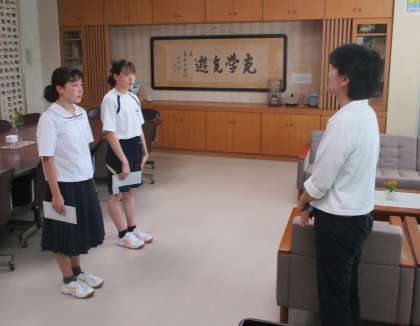 今月17日(木)から、香川県で開催される全国中学校水泳競技大会に出場する細川さん(2年)と遠田さん(2年)の激励会を行いました。2人とも富山県代表としてリレー種目に出場します。