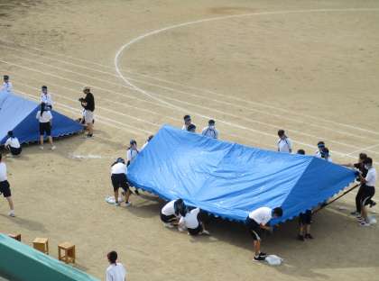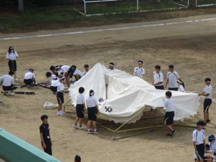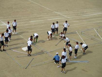 30日(水)団テント設営 公開日 2023/08/30 更新日 2023/08/30 体育大会 体育大会練習スタートの本日、3年生は1限目に団テントを設営しました。全員で協力してテントを組み立て、2限目以降の全体練習に備えることができました。