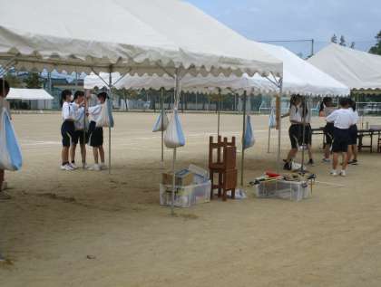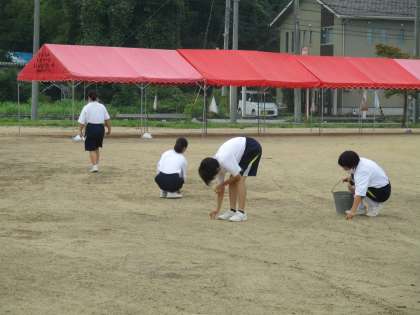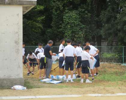 1限目の保健体育の時間に、2年生は追加の土のう作りやグラウンド整備として石拾いに取り組みました。