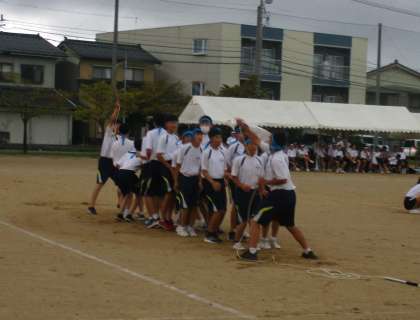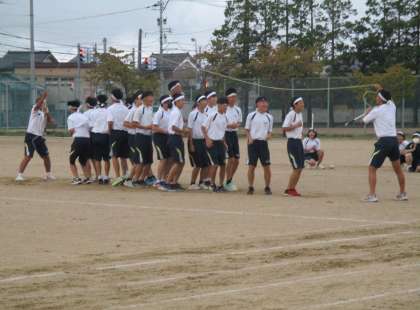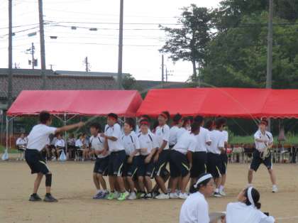 昨日行った第77回体育大会の前半の様子を紹介します。 【写真:みんなでジャンプ(3年男子)】