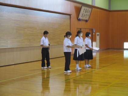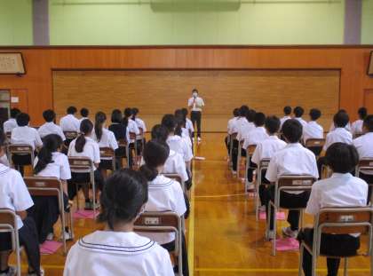 26日(火)高岡校外学習 結団式【1学年】 公開日 2023/09/26 更新日 2023/09/26 1学年 本日5限、1年生は明日の高岡校外学習に向けた結団式を行いました。 目的をふまえた誓いの言葉が学年の代表から伝えられた後、学年主任や団長の教頭先生からのお話がありました。また、しおり作成に貢献してくれた人たちへ、学年生徒会から感謝状が手渡されました。
