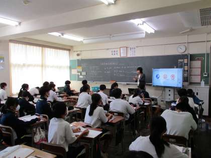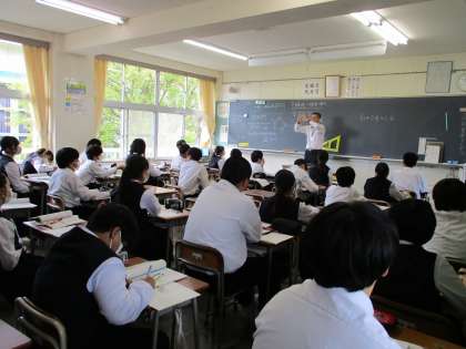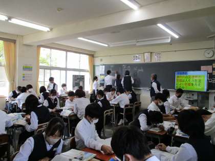 2年生の授業の様子を紹介します。 【写真上:英語】 【写真中:社会】 【写真下:数学】