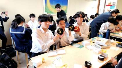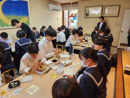 「金銀箔工芸さくだ」での体験学習の様子です。