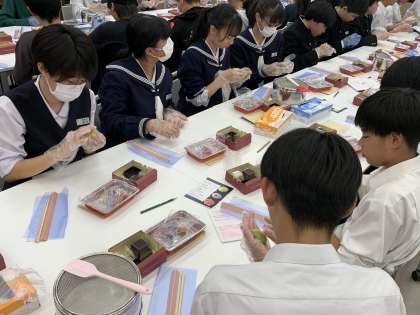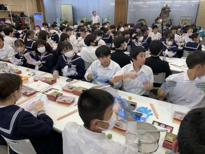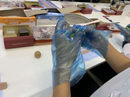 石川県観光物産館での体験学習の様子です。 和菓子作りに励んでいます。