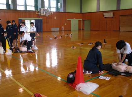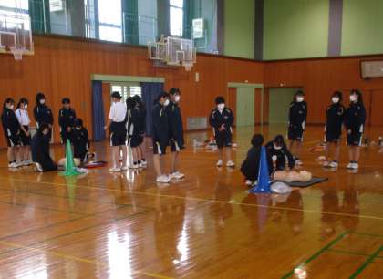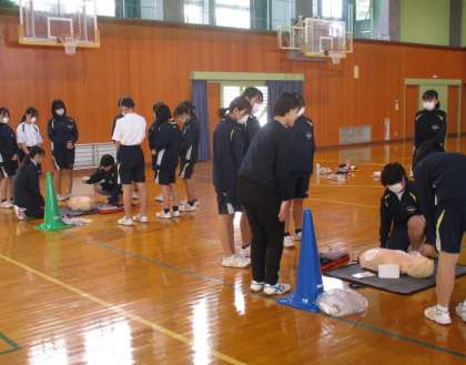 1・2限目の保健体育の授業では、心肺蘇生の実習をサポートしていただきました。