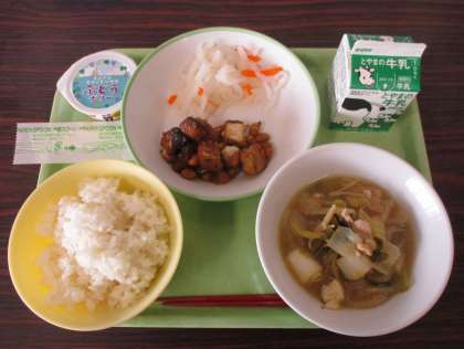 今月は富山県食育推進月間です。「学校給食とやまの日」の今日は、郷土料理「おすわい」や海洋深層水を使用したぜりーなど富山でとれた食材をたくさん取り入れた献立でした。
