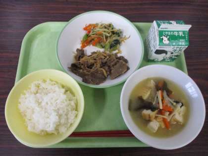 朝鮮料理の一つ「ビビンバ」は、韓国語で混ぜご飯という意味です。どんぶりや専用容器にご飯とナムルや肉、卵などの具を入れ、よくかき混ぜて食べますが、今日の給食では、焼肉に切り干し大根を加えてあり、とてもヘルシーでした。