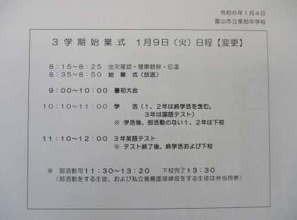 1月5日(金)における、3学年の「到達と確認テスト」の中止・延期に伴い、1月9日(火)の日程を、以下の通り変更します。急な変更となりますが、よろしくお願いします。