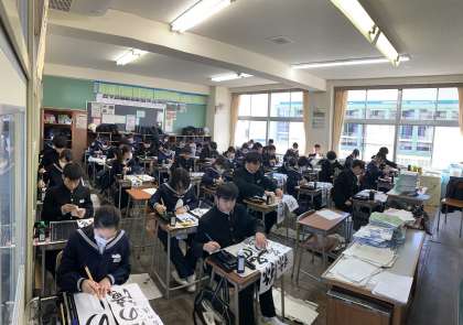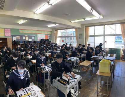 2年生の書き初め大会の様子です。 【写真上:21H】 【写真中:22H】 【写真下:23H】