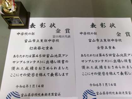 14日(日) 富山地区アンサンブルコンテスト、東部中は打楽器七重奏、金管五重奏ともに金賞!