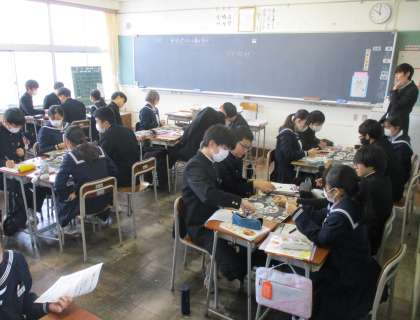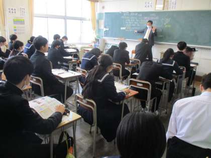 3年生の授業の様子を紹介します。 【写真上:家庭科】 【写真中:英語】 【写真下:社会】