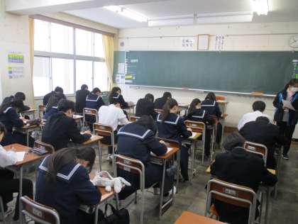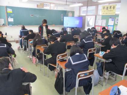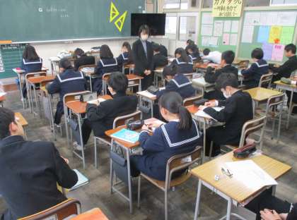 1年生の授業の様子を紹介します。 【写真上:英語】 【写真中:国語(書写)】 【写真下:数学】