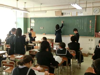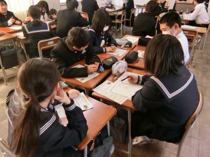 29日(月)先輩になろうプロジェクト【1学年】 公開日 2024/01/29 更新日 2024/01/29 1学年 学活では、学年生徒会と学年書記会が企画・運営をして、先輩になろうプロジェクトを進めています。個人やグループで「どんな先輩になりたいか?」や「先輩と呼ばれるにふさわしい人は、どんな人か?」を考え、全体で発表しています。 各学級の意見をもとに、次回は学年スローガンをつくります。 【写真上:個人目標の作成】 【写真中:グループでの話合い】 【写真下:全体発表の様子】