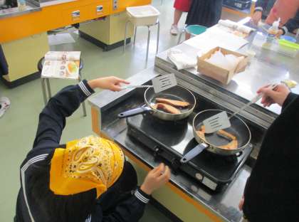31日(水) 学びの様子【1年:家庭科】 公開日 2024/01/31 更新日 2024/01/31 1学年 1年の家庭科の授業では、調理実習に取り組んでいます。先日のハンバーグに続き、今回は「鮭のムニエル」を作りました。