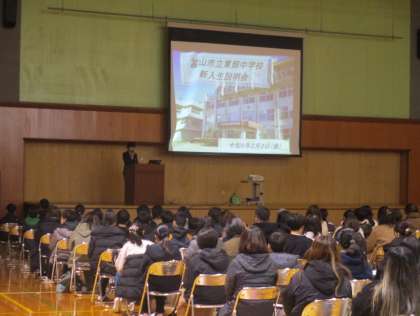 2日(金)新入生説明会 公開日 2024/02/02 更新日 2024/02/02 新入生の保護者の皆様へ 本日、来年度入学予定の小学6年生に向けた学校説明会を実施しました。 校長の挨拶の後、中学校生活について各担当者から説明を行いました。 4月に皆さんが入学されるのを心待ちにしています。