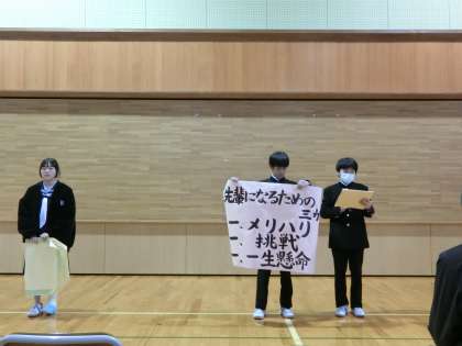 学年生徒会から学年スローガンの発表とそれに込めた思いを発表しました。