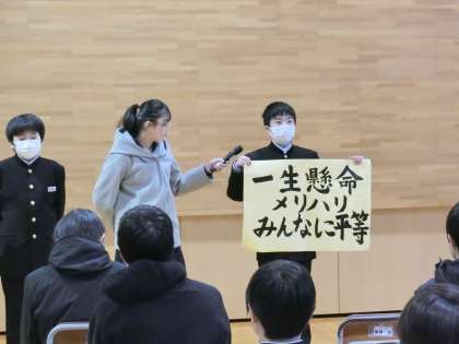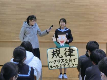 5日(月)先輩になろうプロジェクト(その2)【1学年】 公開日 2024/02/05 更新日 2024/02/05 1学年 各学級の代表が、学級目標とそれに込められた思いを発表しました。 【写真上:11H】 【写真中:12H】 【写真下:13H】