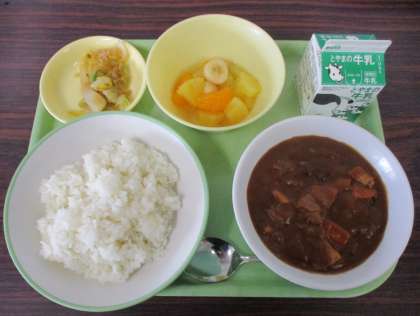8日(木) きょうの給食 公開日 2024/02/08 更新日 2024/02/08 今日の給食 今日の給食を紹介します。上左から 福神和え フルーツミックス 牛乳 たべキリンハヤシ ごはん 今日の献立は、人気の「たべキリンハヤシ」でした。ハヤシルウで、美味しくたっぷりごはんを食べ切れましたか?