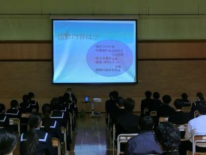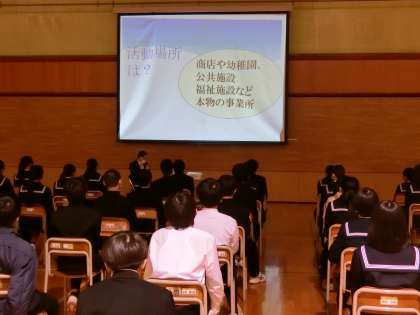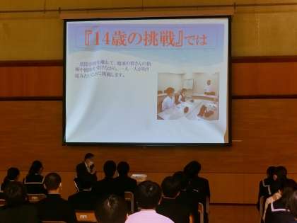 14日(水)「14歳の挑戦」事前集会【1学年】 公開日 2024/02/14 更新日 2024/02/14 1学年 本日の総合的な学習の時間では、次年度7月に実施する「社会に学ぶ『14歳の挑戦』」に向けた集会を行いました。 過去の写真を用いた事業所や活動内容の紹介を通して、生徒たちは自分が働く様子をイメージしていました。 【写真上:活動の紹介】 【写真中:活動場所の紹介】 【写真下:活動内容の紹介】